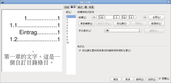 在第二個分頁中,可以決定顯示的格式。我通常將E#和E之間加入10個空格,讓章節編號和標題間有點距離。